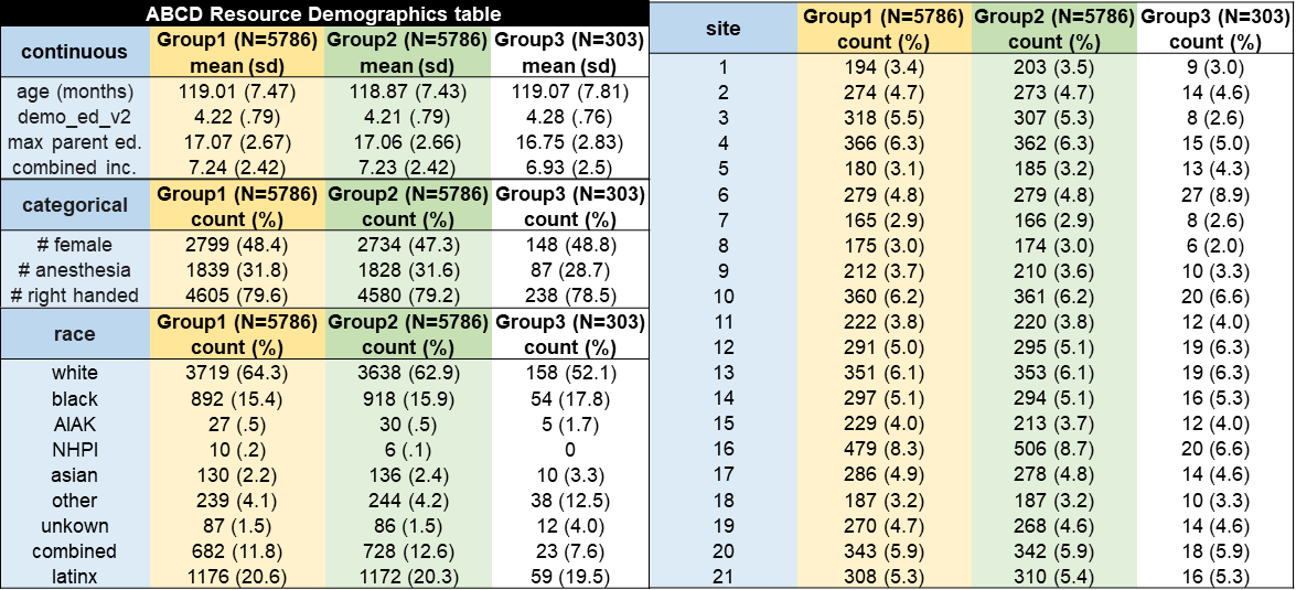 The matched_group field of the participants.tsv file signifies each participant’s assignment to one of the ABCD Reproducible Matched Samples (ARMS). In Release 2.0, ABCD data were split into 3 demographically matched groups: ARMS-1 (N=5,786) and ARMS-2 (N= 5,786) for use as independent datasets, and ARMS-3 (N=305) for template building and model testing. These group assignments have been carried over into the current release, with the following updated counts: ARMS-1 (N=5,752), ARMS-2 (N=5,745), and ARMS-3 (N=301).