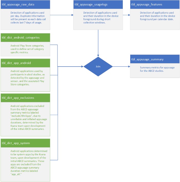 tbl_dict_app_android: Provides individual Android OS applications and the respective categories (e.g., entertainment apps) they were grouped under in the summary tabulated scores (see EARS Device Usage Statistics).tbl_dict_app_ios: Provides individual iOS applications and the respective categories (e.g., entertainment apps) they were grouped under in the summary tabulated scores (see EARS Device Usage Statistics).tbl_dict_app_exclusion&tbl_dict_app_system: Provides a list of applications excluded from summary score calculations (e.g., systems apps or background apps that run continuously).tbl_dict_categories_android: Provides a summary list of the application categories for Android OS users.tbl_dict_categories_ios: Provides a summary list of the application categories for iOS users.